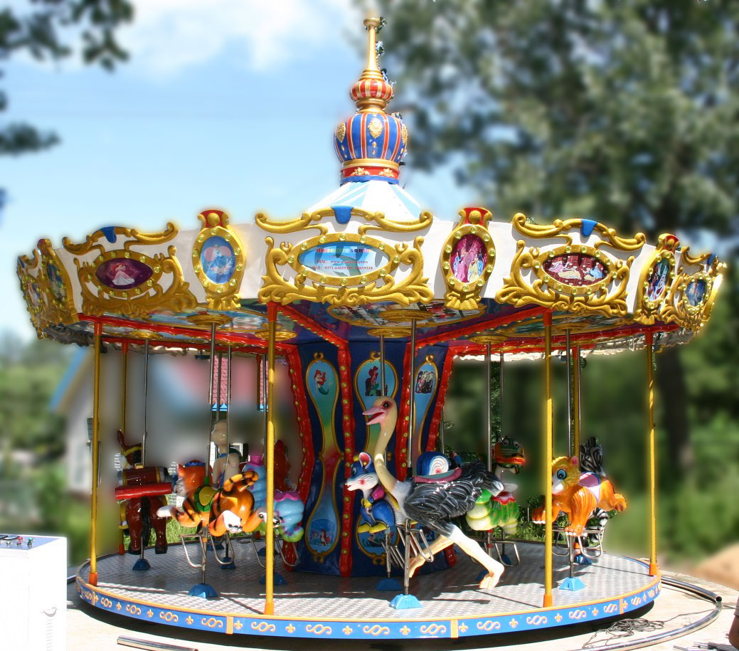 Детская карусель В мире животных представляет собой аттракцион с фигурками различных животных, которые установлены на вращающейся круглой платформе.