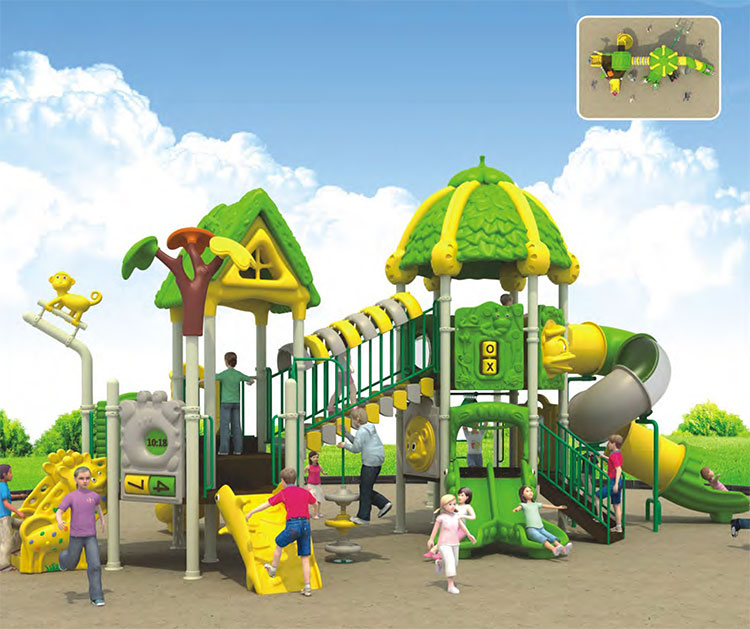 Яркая и разноцветная многоуровневая детская площадка предоставляет возможность для подвижных игр для детей разного возраста как на открытом воздухе, так и в помещении. Наиболее популярны в Украине комбинированные игровые площадки для улицы и помещений в различной комплектации. Некоторые детские комплексы выполнены в форме кораблей или мини-городов. Декораторы украшают игровые элементы фигурами в виде животных или просто красят конструкции в яркие цвета. Игровые комплексы для детской площадки оснащены двойными и одинарными горками на разных уровнях, спиральными и прямыми тоннелями, веревочными и винтовыми лестницами, детскими качелями, домиками с башенками и мостиками, тайными укрытиями, стенками для лазания, турниками и батутами. Особое внимание уделяется материалу, из которого изготовлен детский игровой комплекс – это качественный, устойчивый к перепадам температур, пластик и высокопрочная сталь. Металлическая основа обеспечивает прочность конструкции, яркий пластик помогает достичь привлекательности дизайна, обеспечивает гладкую, ровную, комфортную и беопасную поверхность. Для подстраховки площадки под опасными местами и для полной безопасности детей используется резиновое напольное покрытие.