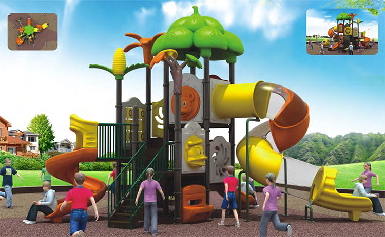 Яркая и разноцветная многоуровневая детская площадка предоставляет возможность для подвижных игр для детей разного возраста как на открытом воздухе, так и в помещении. Наиболее популярны в Украине комбинированные игровые площадки для улицы и помещений в различной комплектации. Некоторые детские комплексы выполнены в форме кораблей или мини-городов. Декораторы украшают игровые элементы фигурами в виде животных или просто красят конструкции в яркие цвета. Игровые комплексы для детской площадки оснащены двойными и одинарными горками на разных уровнях, спиральными и прямыми тоннелями, веревочными и винтовыми лестницами, детскими качелями, домиками с башенками и мостиками, тайными укрытиями, стенками для лазания, турниками и батутами. Особое внимание уделяется материалу, из которого изготовлен детский игровой комплекс – это качественный, устойчивый к перепадам температур, пластик и высокопрочная сталь. Металлическая основа обеспечивает прочность конструкции, яркий пластик помогает достичь привлекательности дизайна, обеспечивает гладкую, ровную, комфортную и беопасную поверхность. Для подстраховки площадки под опасными местами и для полной безопасности детей используется резиновое напольное покрытие.