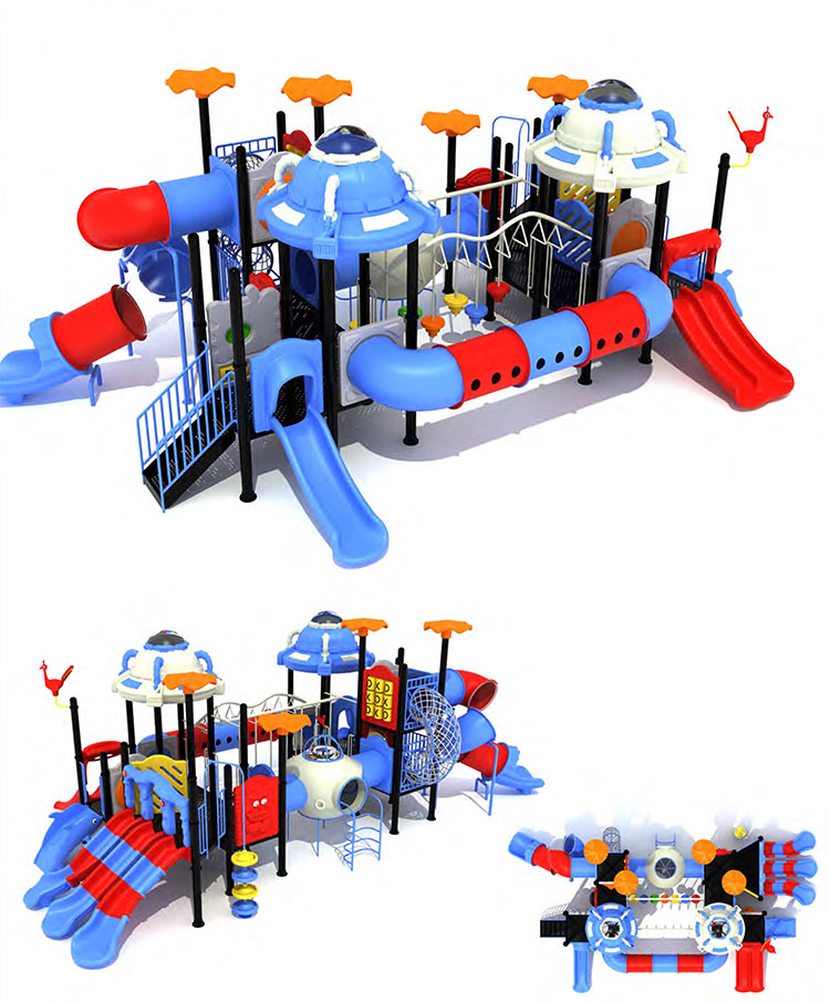 Яркая и разноцветная многоуровневая детская площадка предоставляет возможность для подвижных игр для детей разного возраста как на открытом воздухе, так и в помещении. Наиболее популярны в Украине комбинированные игровые площадки для улицы и помещений в различной комплектации. Некоторые детские комплексы выполнены в форме кораблей или мини-городов. Декораторы украшают игровые элементы фигурами в виде животных или просто красят конструкции в яркие цвета. Игровые комплексы для детской площадки оснащены двойными и одинарными горками на разных уровнях, спиральными и прямыми тоннелями, веревочными и винтовыми лестницами, детскими качелями, домиками с башенками и мостиками, тайными укрытиями, стенками для лазания, турниками и батутами. Особое внимание уделяется материалу, из которого изготовлен детский игровой комплекс – это качественный, устойчивый к перепадам температур, пластик и высокопрочная сталь. Металлическая основа обеспечивает прочность конструкции, яркий пластик помогает достичь привлекательности дизайна, обеспечивает гладкую, ровную, комфортную и беопасную поверхность. Для подстраховки площадки под опасными местами и для полной безопасности детей используется резиновое напольное покрытие.
