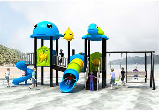 • Элементы детского комплекса: игровые домики, башня для игр, лесенки, горки (спиральная и труба), тоннели, мостики, галереи для переходов, качели.