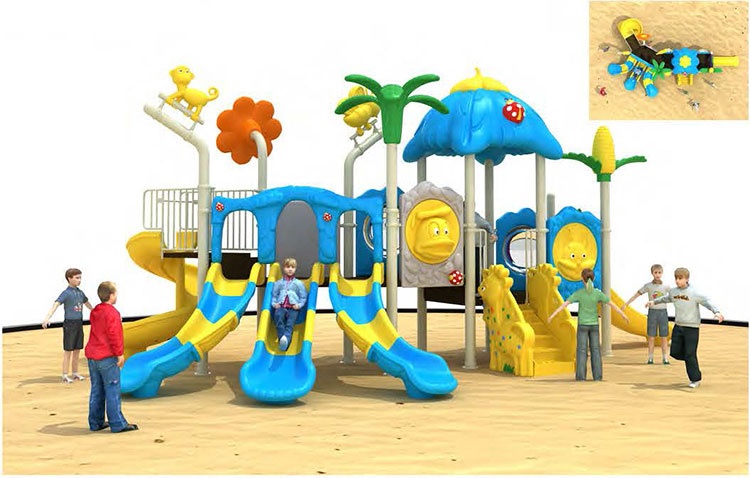 Яркая и разноцветная многоуровневая детская площадка предоставляет возможность для подвижных игр для детей разного возраста как на открытом воздухе, так и в помещении. Наиболее популярны в Украине комбинированные игровые площадки для улицы и помещений в различной комплектации. Некоторые детские комплексы выполнены в форме кораблей или мини-городов. Декораторы украшают игровые элементы фигурами в виде животных или просто красят конструкции в яркие цвета. Игровые комплексы для детской площадки оснащены двойными и одинарными горками на разных уровнях, спиральными и прямыми тоннелями, веревочными и винтовыми лестницами, детскими качелями, домиками с башенками и мостиками, тайными укрытиями, стенками для лазания, турниками и батутами. Особое внимание уделяется материалу, из которого изготовлен детский игровой комплекс – это качественный, устойчивый к перепадам температур, пластик и высокопрочная сталь. Металлическая основа обеспечивает прочность конструкции, яркий пластик помогает достичь привлекательности дизайна, обеспечивает гладкую, ровную, комфортную и беопасную поверхность. Для подстраховки площадки под опасными местами и для полной безопасности детей используется резиновое напольное покрытие.