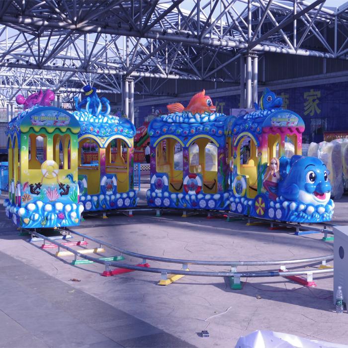 Детский поезд Океан движется по специально проложенным рельсам в сопровождении веселой музыки.