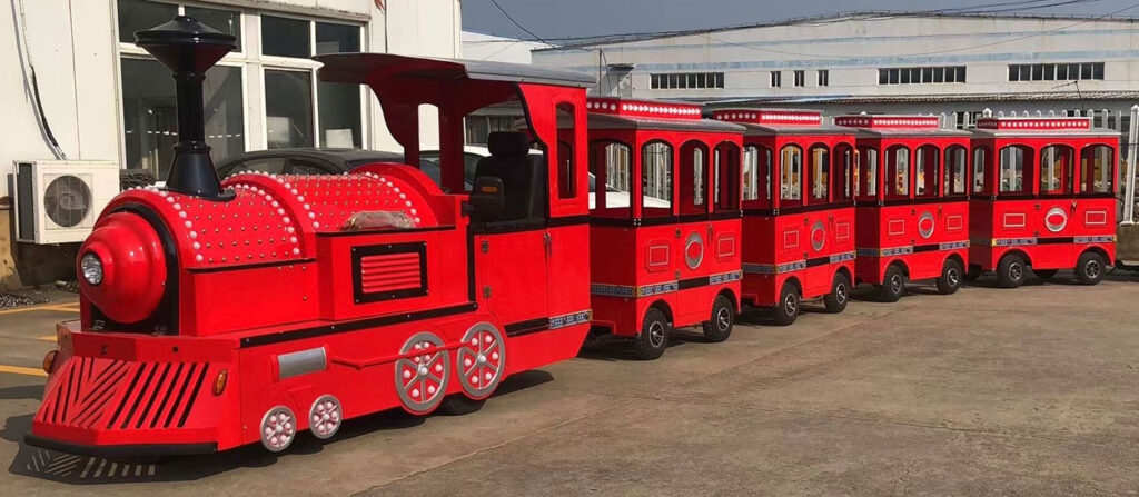 Детский поезд на пневмоходу 2 позволяет кататься 24 пассажирам по любой траектории без прокладывания специальных рельсов.